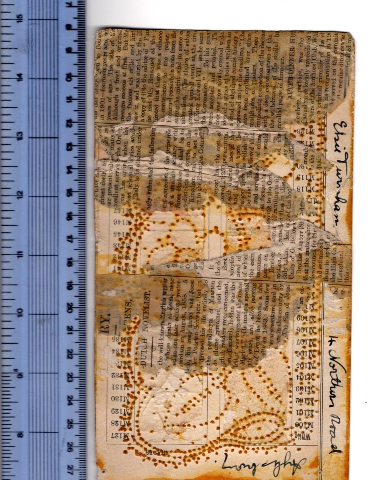 The reverse side of a pricking from the Elsie Turnham Collection. The back of prickings can be very interesting and privide a glimpse into the social history of the time.
